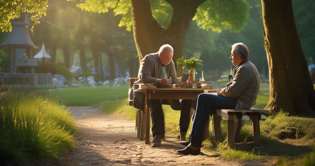 Zwei Männer sitzen im Garten auf Bio-Teak beplankten Stahlrohr-Freischwingern an einem großen Tisch. Auf dem Tisch eine dicke Kerze in einer hohen Glasvase, ein Paar Gartenhandschuhe, ein geschmacklos bunter Plastikbesen und zwei dicke Porzellantassen, die eine bordeauxrot, die andere türkisblau.